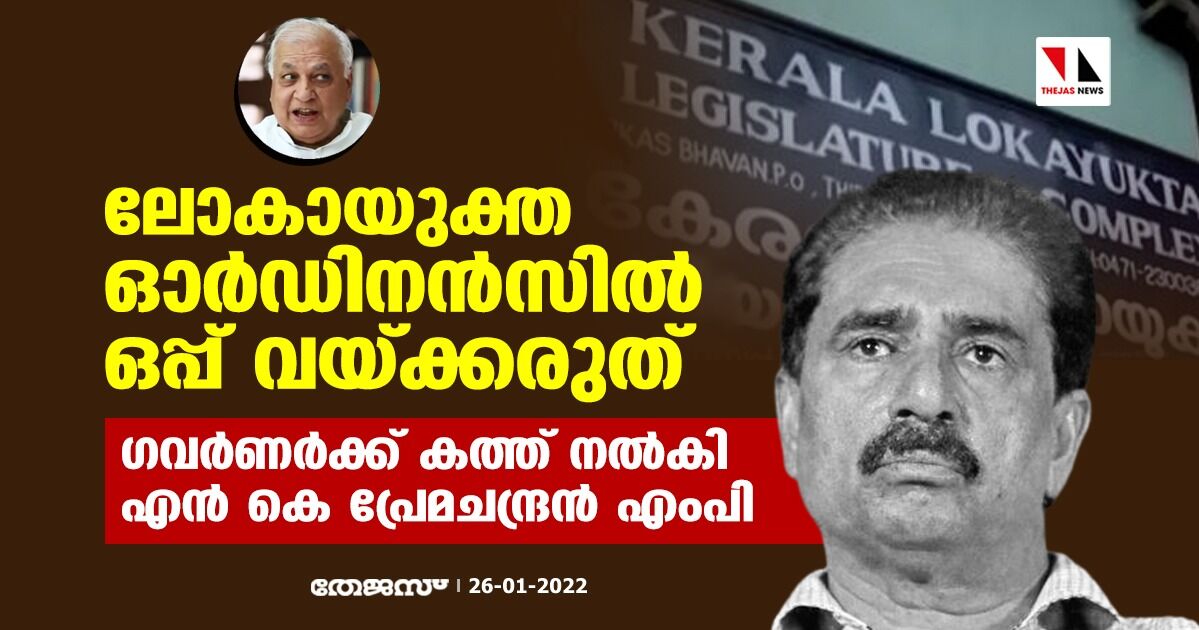 ലോകായുക്ത ഓര്ഡിനന്സില് ഒപ്പ് വെയ്ക്കരുത്; ഗവര്ണര്ക്ക് കത്ത് നല്കി എന് കെ പ്രേമചന്ദ്രന് എംപി