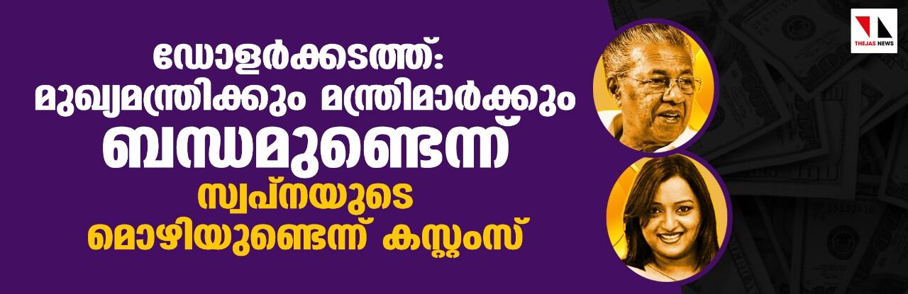 ഡോളര്ക്കടത്ത്: മുഖമന്ത്രിക്കും മന്ത്രിമാര്ക്കും ബന്ധമുണ്ടെന്ന് സ്വപ്നയുടെ മൊഴിയുണ്ടെന്ന് കസ്റ്റംസ്