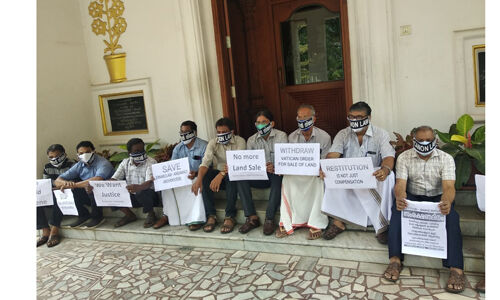 എറണാകുളം-അങ്കമാലി അതിരൂപതയിലെ ഭൂമി വില്പന: ബിഷപ്പ് ഹൗസിനു മുന്നില് വായ്മൂടിക്കെട്ടി പ്രതിഷേധിച്ച് അല്മായ മുന്നേറ്റം