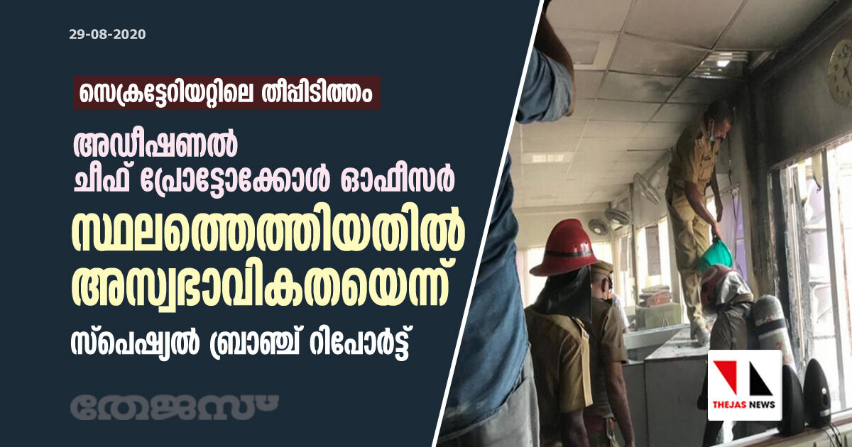 സെക്രട്ടേറിയറ്റിലെ തീപ്പിടിത്തം; അഡീഷണല് ചീഫ് പ്രോട്ടോക്കോള് ഓഫീസര് സ്ഥലത്തെത്തിയതില് അസ്വഭാവികതയെന്ന് സ്പെഷ്യല് ബ്രാഞ്ച് റിപോര്ട്ട്