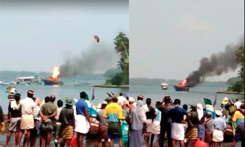 ബോട്ടിനുള്ളില് ഭക്ഷണം പാകം ചെയ്യുന്നതിനിടെ അബദ്ധത്തില് തീപടരുകയായിരുന്നുവെന്നാണ് നിഗമനം. ജീവനക്കാര് കടലില് ചാടിയശേഷമാണ് ഗ്യാസ് പൊട്ടിത്തെറിച്ച് കൂടുതല് അപകടമുണ്ടായത്. ആര്ക്കും പരിക്കേല്ക്കുകയോ ആളപായമുണ്ടാവുകയോ ചെയ്തിട്ടില്ല. ബോട്ട് പൂര്ണമായും കത്തിനശിച്ചതായാണ് വിവരം.