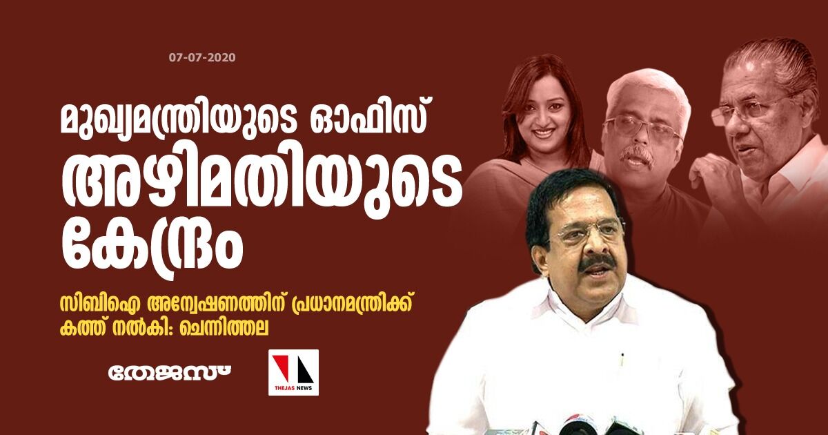 മുഖ്യമന്ത്രിയുടെ ഓഫീസ് അഴിമതിയുടെ കേന്ദ്രം; സിബിഐ അന്വേഷണത്തിന് പ്രധാനമന്ത്രിക്ക് കത്തുനൽകി: ചെന്നിത്തല