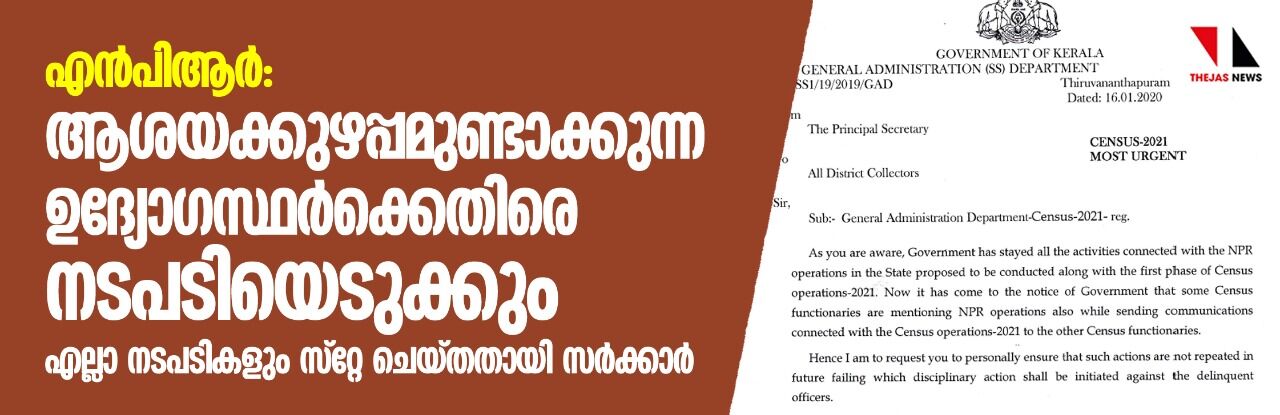 2021-ലെ സെന്സസ് നടപടികള് സംബന്ധിച്ച അറിയിപ്പ് നല്കുന്നതിനിടയ്ക്ക് ചില സെന്സസ് ഉദ്യോഗസ്ഥര് എന്പിആര് പുതുക്കുന്ന കാര്യം പരാമര്ശിച്ച സാഹചര്യത്തിലാണ് സര്ക്കാര് ഇക്കാര്യം വ്യക്തമാക്കിയത്. ഇത്തരം നടപടികള് ആവര്ത്തിക്കുന്ന ഉദ്യോഗസ്ഥര്ക്കെതിരെ അച്ചടക്ക നടപടി എടുക്കണമെന്നും കലക്ടര്മാര്ക്ക് പ്രിന്സിപ്പല് സെക്രട്ടറി നിര്ദേശം നല്കി.