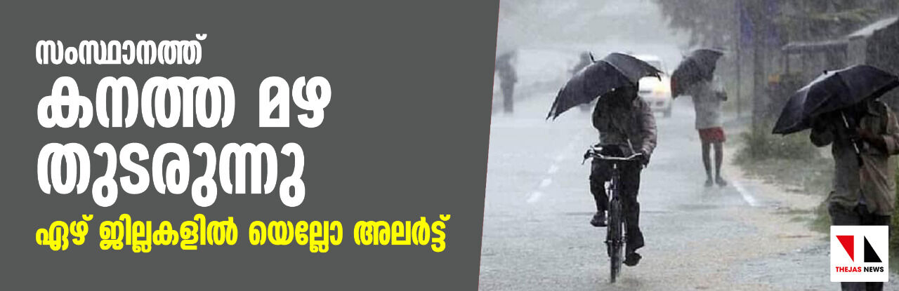 സംസ്ഥാനത്ത് കനത്ത മഴ തുടരുന്നു; ഏഴ് ജില്ലകളില് ഇന്ന് യെല്ലോ അലര്ട്ട്
