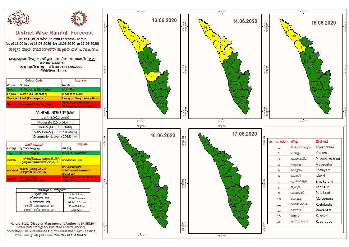 ഇന്ന് എറണാകുളം, കോഴിക്കോട്, വയനാട്, കണ്ണൂർ, കാസർഗോഡ് ജില്ലകളിലും നാളെ മലപ്പുറം, കോഴിക്കോട്, വയനാട്, കണ്ണൂർ, കാസർഗോഡ് ജില്ലകളിലും മഞ്ഞ അലർട്ട് പ്രഖ്യാപിച്ചു. 15 ന് കോഴിക്കോട്, കണ്ണൂർ, കാസർഗോഡ് ജില്ലകളിലും കേന്ദ്ര കാലാവസ്ഥ വകുപ്പ് മഞ്ഞ അലർട്ട് പ്രഖ്യാപിച്ചിട്ടുണ്ട്.