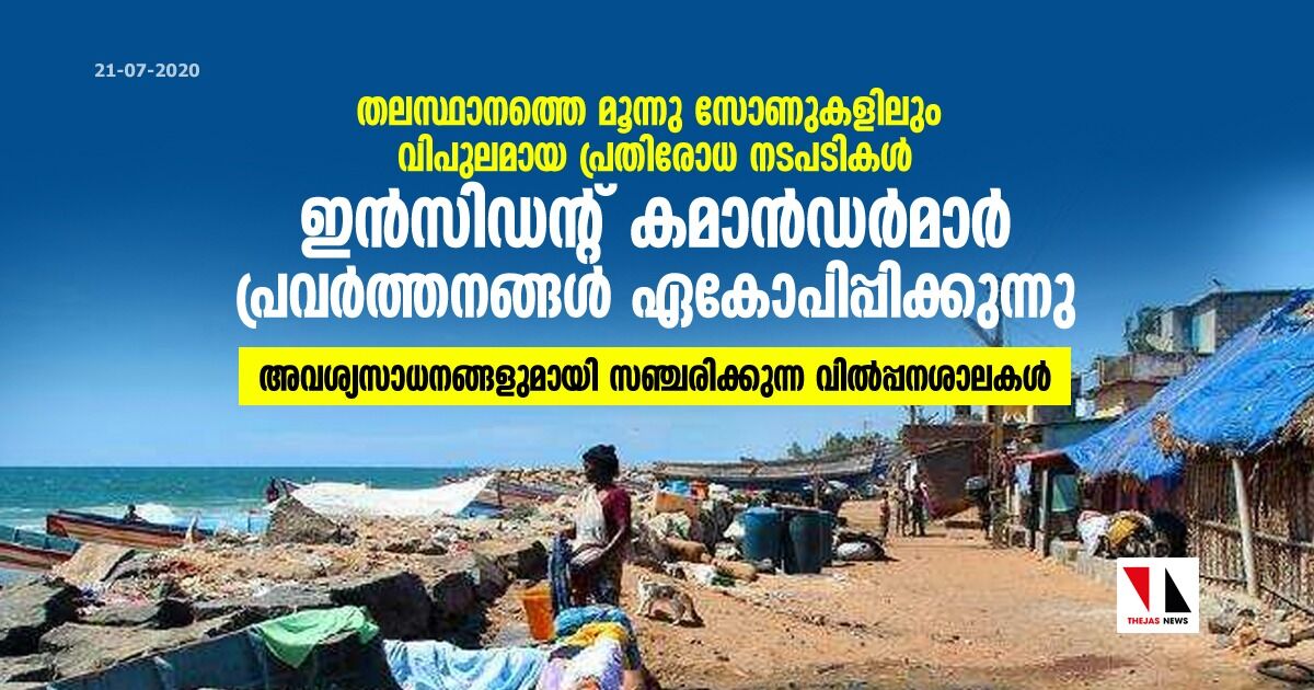 തിരുവനന്തപുരം: ജില്ലയിലെ മൂന്നു തീരദേശ സോണുകളിലും ഇന്സിഡന്റ് കമാന്ഡര്മാരുടെ നേതൃത്വത്തില് വിപുലമായ കൊവിഡ് 19 പ്രതിരോധ പ്രവര്ത്തനങ്ങള് ആരംഭിച്ചു. ഒന്നാം സോണായ ഇടവ മുതല് പെരുമാതുറ വരെയും രണ്ടാം സോണായ പെരുമാതുറ മുതല് വിഴിഞ്ഞം വരെയും മൂന്നാം സോണായ വിഴിഞ്ഞം മുതല് പൊഴിയൂര് വരെയും പൊതുജനങ്ങള്ക്ക് അവശ്യസാധനങ്ങള് നേരിട്ടു ലഭ്യമാക്കാന് സിവില് സപ്ലൈസ്, ഹോര്ട്ടികോര്പ്പ് , കെപ്കോ തുടങ്ങിയവയുടെ സഞ്ചരിക്കുന്ന വാഹനങ്ങള് എത്തും. തിരക്കൊഴിവാക്കുന്നതിനായി ഓരോ പ്രദേശത്തും പ്രത്യേകം സമയക്രമം നിശ്ചയിച്ചാകും വില്പ്പന.