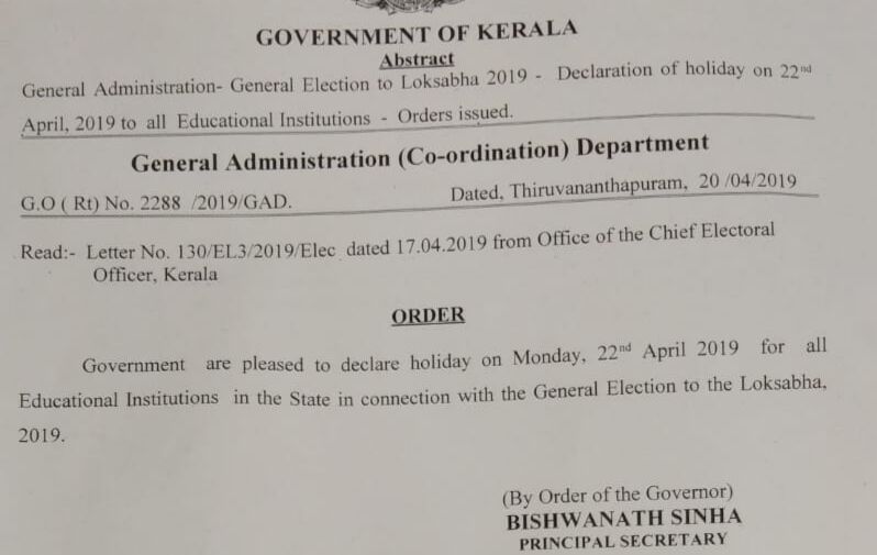ലോക്സഭാ തിരഞ്ഞെടുപ്പ്: 22ന് സംസ്ഥാനത്തെ വിദ്യാഭ്യാസ സ്ഥാപനങ്ങൾക്ക് അവധി