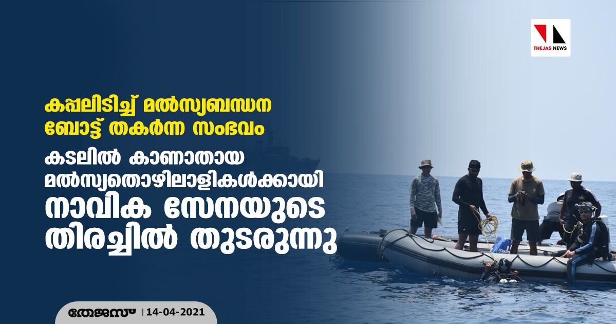 കപ്പലിടിച്ച് മല്സ്യബന്ധന ബോട്ട് തകര്ന്ന സംഭവം: കടലില് കാണാതായ മല്സ്യതൊഴിലാളികള്ക്കായി നാവിക സേനയുടെ തിരച്ചില് തുടരുന്നു