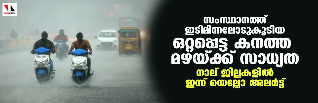 സംസ്ഥാനത്ത് ഇടിമിന്നലോടുകൂടിയ ഒറ്റപ്പെട്ട കനത്ത മഴയ്ക്ക് സാധ്യത; നാല് ജില്ലകളില് ഇന്ന് യെല്ലോ അലര്ട്ട്