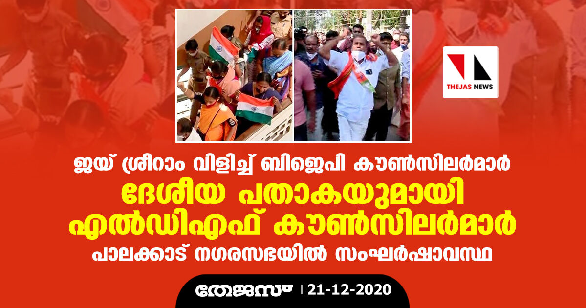 പാലക്കാട് ജയ് ശ്രീറാം വിളിച്ച് ബിജെപി കൗണ്സിലര്മാര്; ദേശീയ പതാക പ്രദര്ശിപ്പിച്ച് എല്ഡിഎഫ് കൗണ്സിലര്മാര്