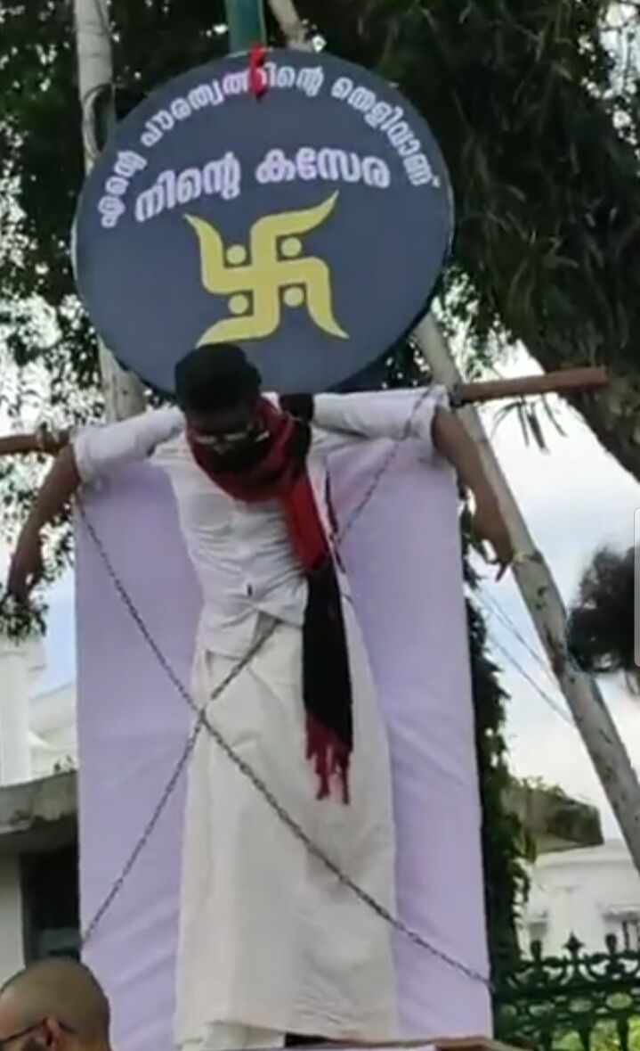പൗരത്വത്തിന്റ പേരില് കുരിശില് തൂക്കിലേറ്റപ്പെട്ട അവസ്ഥയില് തൂങ്ങിക്കിടന്നായിരുന്നു കമല് സി നജ്മല് പ്രതിഷേധിച്ചത്. കൂടെ അദ്ദേഹത്തിന്റെ മകളുമുണ്ടായിരുന്നു.