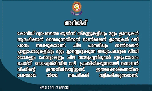 ഈ മഹാമാരിയുടെ ഘട്ടത്തിലും വരുംതലമുറയുടെ വിദ്യാഭ്യാസത്തിനായി ആവിഷ്ക്കരിച്ചിരിക്കുന്ന ബദല് സംവിധാനങ്ങളെയും അധ്യാപക സമൂഹത്തെയും അവഹേളിക്കുന്ന നടപടികള് ശരിയല്ല. നമ്മുടെ കുട്ടികളും ഇതൊക്കെ കണ്ട് വളരുന്നവരാണെന്ന ബോധ്യം എല്ലാവര്ക്കുമുണ്ടാകണമെന്നും കേരള പോലിസ് വ്യക്തമാക്കി.
