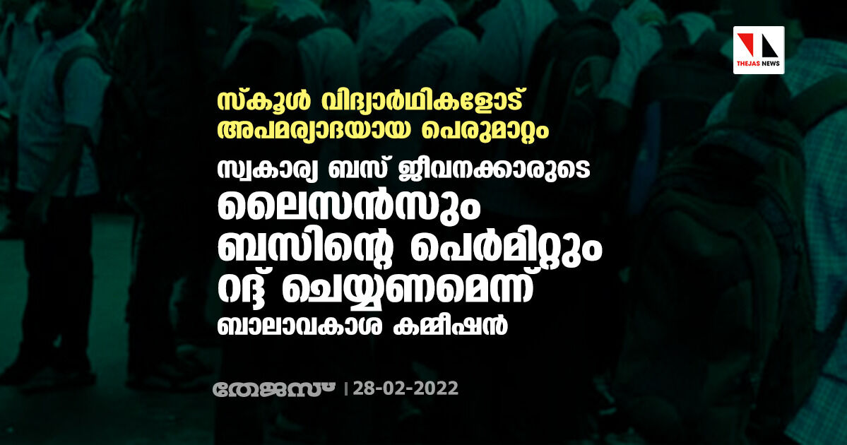 സ്കൂള് വിദ്യാര്ഥികളോട് അപമര്യാദയായ പെരുമാറ്റം:സ്വകാര്യ ബസ് ജീവനക്കാരുടെ ലൈസന്സും ബസിന്റെ പെര്മിറ്റും റദ്ദ് ചെയ്യണമെന്ന് ബാലാവകാശ കമ്മീഷന്