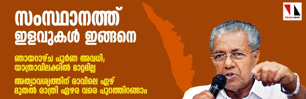 സംസ്ഥാനത്ത് ഇളവുകള് ഇങ്ങനെ; ഞായറാഴ്ച പൂര്ണ അവധി, യാത്രാവിലക്കില് മാറ്റമില്ല