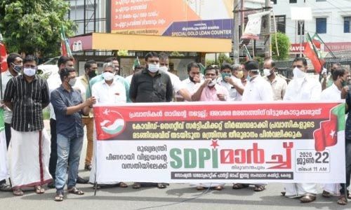 തിരുവനന്തപുരം: പ്രവാസികള്ക്ക് നാട്ടിലേക്ക് മടങ്ങിവരാന് അനുമതി ലഭിക്കുന്നതിന് കൊവിഡ് പരിശോധന നിര്ബന്ധമാക്കിയ സംസ്ഥാന മന്ത്രിസഭാ തീരുമാനം സ്വന്തം ജനതയോടുള്ള വഞ്ചനയാണെന്നും ഉടന് പൂര്ണമായും പിന്വലിക്കണമെന്നും എസ്ഡിപിഐ സംസ്ഥാന ജനറല് സെക്രട്ടറി തുളസീധരന് പള്ളിക്കല്. ഈ ആവശ്യമുന്നയിച്ച് എസ്ഡിപിഐ സംസ്ഥാന കമ്മിറ്റി സംഘടിപ്പിച്ച 20 മന്ത്രിമന്ദിരങ്ങളിലേക്കുള്ള മാര്ച്ച് ഉദ്ഘാടനം ചെയ്യുകയായിരുന്നു അദ്ദേഹം.