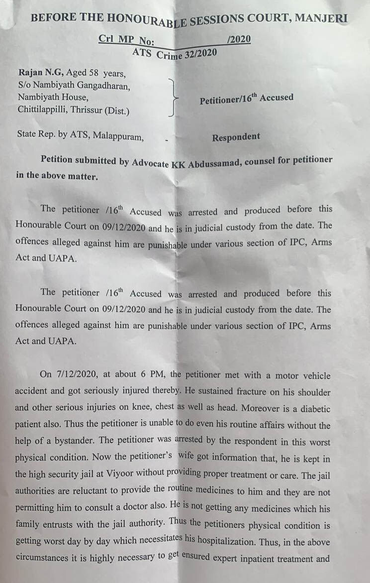 മാവോവാദി നേതാവ് രാജന് ചിറ്റിലപ്പള്ളിക്ക് ജയിലില് ചികില്സാ നിഷേധം; സൂപ്രണ്ടിനോട് വിശദീകരണം തേടി മഞ്ചേരി സെഷന്സ് കോടതി
