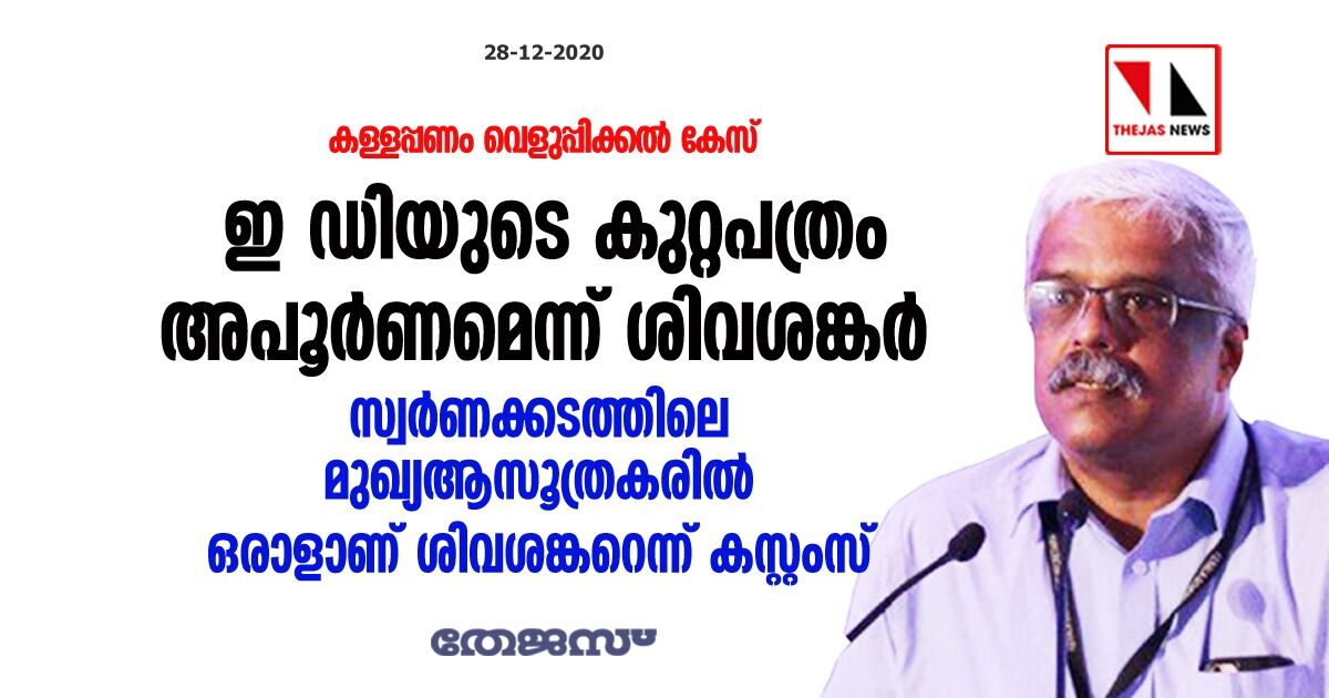 കള്ളപ്പണം വെളുപ്പിക്കല് കേസ്: ഇ ഡിയുടെ കുറ്റപത്രം അപൂര്ണമെന്ന് ശിവശങ്കര്; സ്വര്ണക്കടത്തിലെ മുഖ്യആസൂത്രകരില് ഒരാളാണ് ശിവശങ്കറെന്ന് കസ്റ്റംസ്