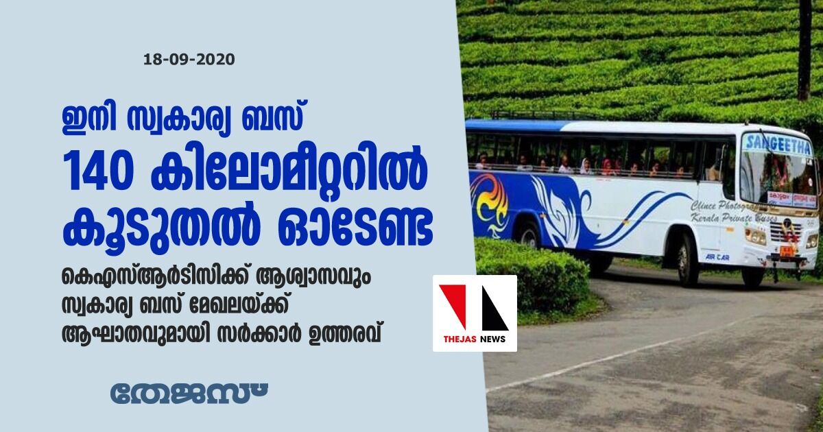 ഇനി സ്വകാര്യ ബസ് 140 കിലോമീറ്ററില് കൂടുതല് ഓടേണ്ട; കെഎസ്ആര്ടിസിക്ക് ആശ്വാസവും സ്വകാര്യ ബസ് മേഖലയ്ക്ക് ആഘാതവുമായി സര്ക്കാര് ഉത്തരവ്