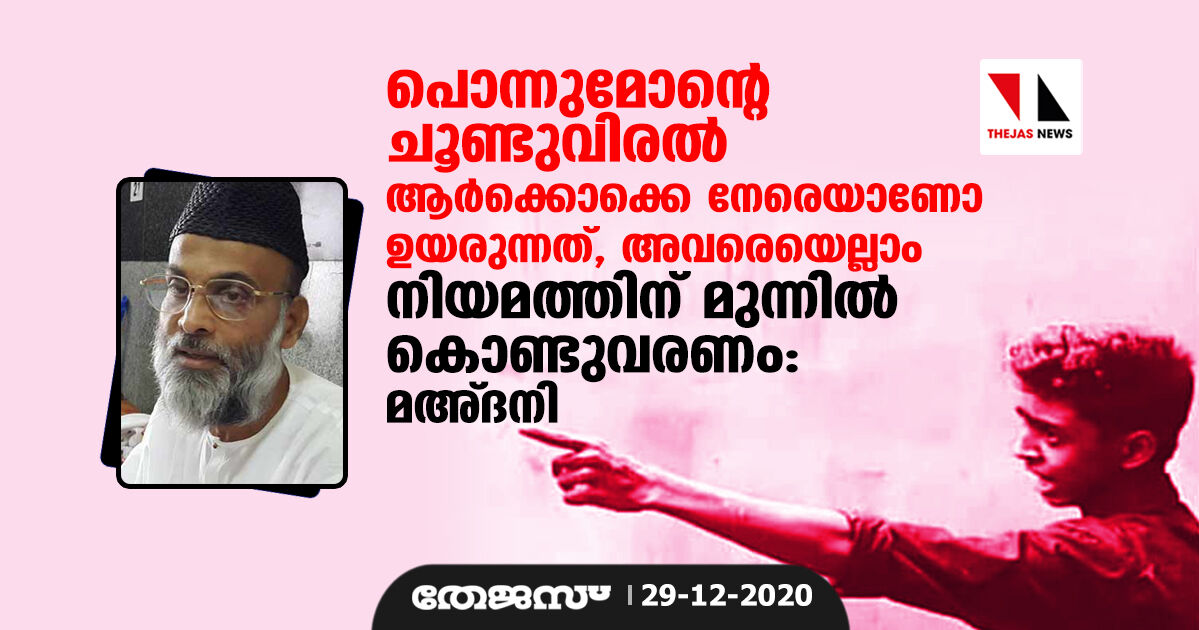 പൊന്നുമോന്റെ ചൂണ്ടുവിരല് ആര്ക്കൊക്കെ നേരെയാണോ ഉയരുന്നത്, അവരെയെല്ലാം നിയമത്തിന് മുന്നില് കൊണ്ടുവരണം: മഅ്ദനി