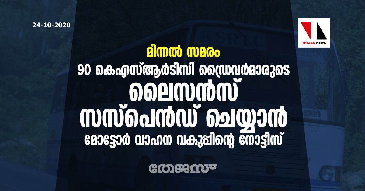 മിന്നല് സമരം: 90 കെഎസ്ആര്ടിസി ഡ്രൈവര്മാരുടെ ലൈസന്സ് സസ്പെന്ഡ് ചെയ്യാന് മോട്ടോര് വാഹന വകുപ്പിന്റെ നോട്ടീസ്