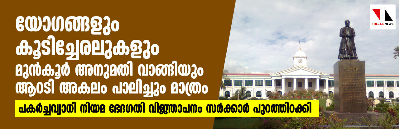തിരുവനന്തപുരം: മുൻകൂർ അനുമതി വാങ്ങിയും ആറടി അകലം പാലിച്ചും മാത്രമേ യോഗങ്ങളോ കൂടിച്ചേരലുകളോ അനുവദിക്കുകയുള്ളൂവെന്ന് സംസ്ഥാന സർക്കാർ. ഇക്കാര്യം ചൂണ്ടിക്കാട്ടി പകർച്ചവ്യാധി നിയമ ഭേദഗതി വിജ്ഞാപനം സർക്കാർ പുറത്തിറക്കി. പൊതുസ്ഥലങ്ങളിലും ജോലി സ്ഥലങ്ങളിലും മുഖാവരണം നിർബന്ധമാക്കി.