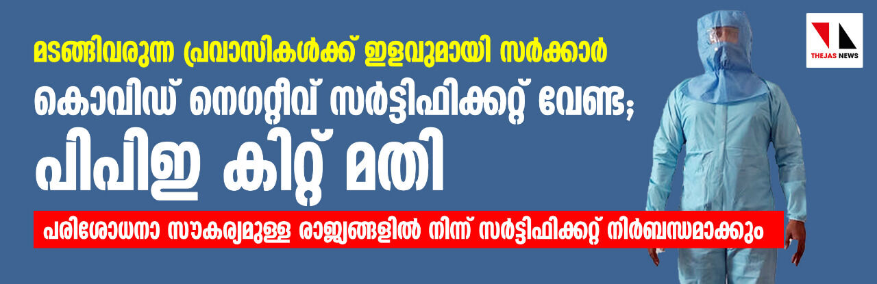 മടങ്ങിവരുന്ന പ്രവാസികൾക്ക് ഇളവുമായി സർക്കാർ; കൊവിഡ് സർട്ടിഫിക്കറ്റ് വേണ്ട, പിപിഇ കിറ്റ് മതി