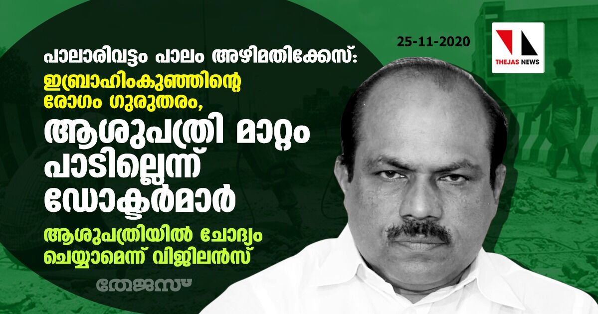 പാലാരിവട്ടം പാലം അഴിമതിക്കേസ്:ഇബ്രാഹിംകുഞ്ഞിന്റെ രോഗം ഗുരുതരം,ആശുപത്രി മാറ്റം പാടില്ലെന്ന് ഡോക്ടര്മാര്;ആശുപത്രിയില് ചോദ്യം ചെയ്യാമെന്ന് വിജിലന്സ്