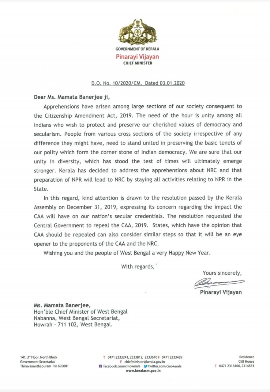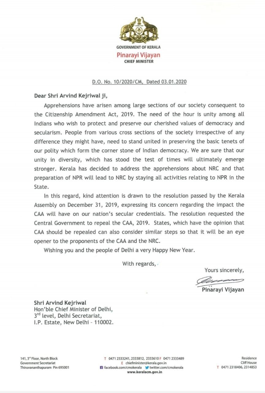 പൗരത്വ ഭേദഗതി നിയമം നമ്മുടെ രാജ്യത്തിന്റെ മതേതര മൂല്യങ്ങളെ ബാധിക്കുന്നതിലെ ആശങ്ക വ്യക്തമാകുന്ന പ്രമേയം കേരള നിയമസഭ ഡിസംബർ 31 ന് പാസാക്കിയിട്ടുണ്ട്. അതിലേക്കു ശ്രദ്ധ ക്ഷണിച്ച മുഖ്യമന്ത്രി പൗരത്വ ഭേദഗതി നിയമം പിൻവലിക്കണമെന്ന് ആ പ്രമേയം കേന്ദ്ര സർക്കാരിനോട് ആവശ്യപ്പെടുന്നു എന്ന് വിശദീകരിച്ചു. പൗരത്വ ഭേദഗതി നിയമം റദ്ദാക്കണം എന്ന അഭിപ്രായമുള്ള സംസ്ഥാനങ്ങൾ സമാനമായ നടപടികളിലേക്കു നീങ്ങുന്നത് പരിഗണിക്കണം എന്ന് മുഖ്യമന്ത്രി അഭ്യർത്ഥിച്ചു. അങ്ങനെയുള്ള നീക്കം പൗരത്വ ഭേദഗതി നിയമത്തിന്റെയും ദേശീയ പൗരത്വ രജിസ്റ്ററിന്റെയും വക്താക്കളുടെ കണ്ണ് തുറപ്പിക്കും എന്നും മുഖ്യമന്ത്രി പിണറായി വിജയൻ പ്രത്യാശ പ്രകടിപ്പിച്ചു.