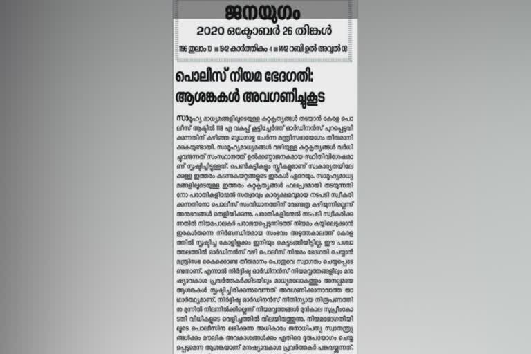 കേസ് എടുക്കുന്നതിനുള്ള വിവേചനാധികാരം പുതിയ നിയമത്തിലൂടെ പോലിസിന് ലഭിക്കുന്നു. ആധുനിക നിയമവാഴ്ച സംവിധാനത്തിലും നീതി നിര്വഹണത്തിനും അപകടകരമായ വഴിത്തിരിവായി മാറിയേക്കും എന്ന ആശങ്ക ശക്തമാണെന്നും ലേഖനത്തില് സിപിഐ ചൂണ്ടിക്കാട്ടുന്നു.സാമൂഹിക മാധ്യമങ്ങളിലൂടെയുള്ള കുറ്റകൃത്യങ്ങള് പ്രത്യേകിച്ചും പെണ്കുട്ടികള്ക്കും സ്ത്രീകള്ക്കും എതിരായവ തടഞ്ഞേ മതിയാകൂ. ആവശ്യമെങ്കില് അതിന് കര്ക്കശ നിയമനിര്മാണത്തിനും മടിക്കേണ്ടതില്ല. എന്നാല് ഒരു നിയമനിര്മാണവും നിലവിലുള്ള അഭിപ്രായസ്വാതന്ത്ര്യം, മൗലികാവകാശങ്ങള്, ജനാധിപത്യ സ്വാതന്ത്ര്യം ,മനുഷ്യാവകാശങ്ങള് എന്നിവയെ ഹനിക്കുന്നതോ പരിമിതപ്പെടുത്തുന്നതോ ആയിക്കൂടായെന്നും മുഖപ്രസംഗത്തില് ആവശ്യപ്പെടുന്നു. അവധാനപൂര്വം വിപുലവും ക്രിയാത്മകവും ജനാധിപത്യപരവുമായ ചര്ച്ചകളിലൂടെ വേണം അത്തരം നിയമങ്ങള് ഉരുത്തിരിയാനെന്നും ജനയുഗം വ്യക്തമാക്കുന്നു. പൊലീസ് നിയമ ഭേദഗതിയ്ക്ക് മന്ത്രിസഭ തീരുമാനിച്ച ശേഷമാണ് ലേഖനത്തിലൂടെ സിപിഐ പരസ്യമായി ഭിന്നത വ്യക്തമാക്കുന്നത്