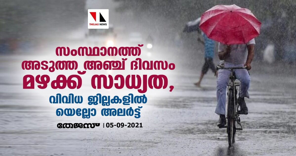 സംസ്ഥാനത്ത് അടുത്ത അഞ്ച് ദിവസം മഴക്ക് സാധ്യത, വിവിധ ജില്ലകളിൽ യെല്ലോ അലർട്ട്