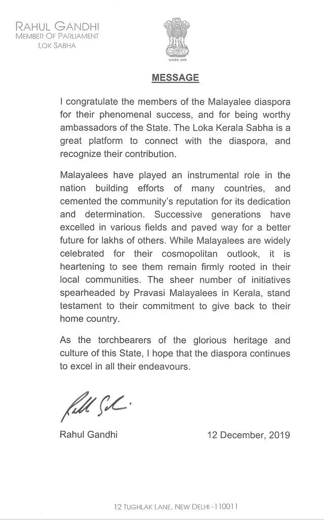 പ്രതിപക്ഷം ബഹിഷ്കരിച്ച ലോക കേരളസഭയെ അഭിനന്ദിച്ച് രാഹുൽ ഗാന്ധി എംപിയുടെ കത്ത് മുഖ്യമന്ത്രിയാണ് പുറത്തുവിട്ടത്. പ്രവാസികളായ കേരളീയരെ ഒരുമിച്ച് ഒരു വേദിയിൽ കൊണ്ടുവരാനും അവരുടെ സംഭാവനകൾക്ക് വേണ്ട അംഗീകാരം നൽകാനും കഴിയുന്ന മികച്ച വേദിയാണ് ലോക കേരളസഭയെന്ന് രാഹുൽ അഭിപ്രായപ്പെട്ടു. മുഖ്യമന്ത്രി കത്ത് ട്വീറ്റ് ചെയ്യുകയും രാഹുൽ ഗാന്ധിക്ക് നന്ദി പറയുകയും ചെയ്തിരുന്നു.