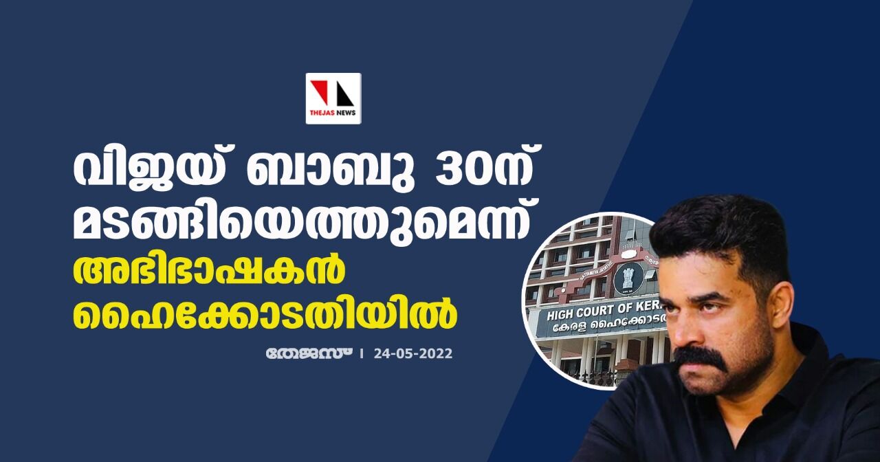 വിജയ് ബാബു 30ന് മടങ്ങിയെത്തുമെന്ന് അഭിഭാഷകന് ഹൈക്കോടതിയില്