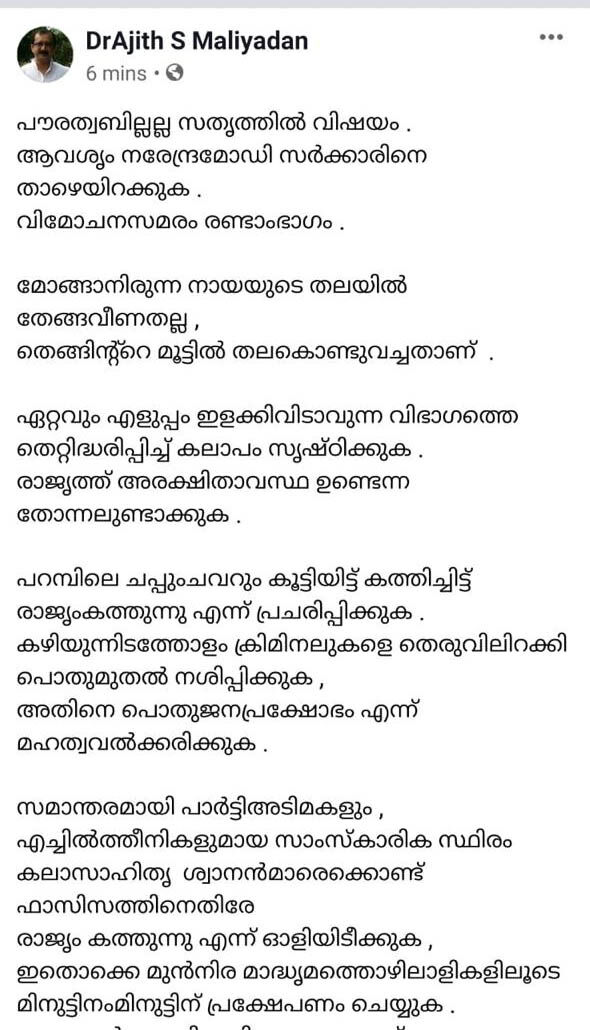 വര്ഷങ്ങളായി ദോഹയിലെ നസിം അല് റബീഹ് ക്ലിനിക്കില് ഓര്ത്തോ വിഭാഗത്തില് ജോലിചെയ്യുന്ന കൊല്ലം കരുനാഗപ്പള്ളി സ്വദേശിയായ ഡോക്ടര് അജിത്കുമാര്, ഡോ.അജിത് എസ് മാളിയാടന് എന്ന പേരിലുള്ള ഫെയ്സ്ബുക്ക് അക്കൗണ്ടിലാണ് പൗരത്വ നിയമത്തിനെതിരേയും എന്ആര്സിക്കെതിരേയും ഇന്ത്യയൊട്ടുക്കും നടക്കുന്ന പ്രതിഷേധ സമരങ്ങളെ പരിഹസിച്ചുകൊണ്ട് പോസ്റ്റിട്ടത്.