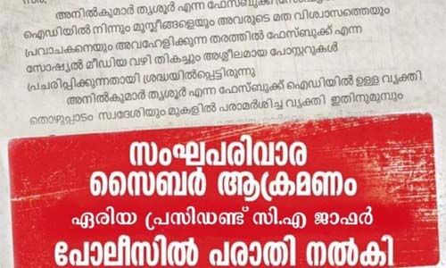 ഈ ഐഡിയില്നിന്ന് മുമ്പും ഇത്തരം വര്ഗീയത വളര്ത്തുന്നരീതിയിലുള്ള പോസ്റ്റുകള് പ്രചരിപ്പിച്ചിട്ടുണ്ട്. പോപുലര് ഫ്രണ്ട് ചേലക്കര ഏരിയാ പ്രസിഡന്റ് സി എ ജാഫര് പോലിസില് പരാതി നല്കിയതിന്റെ അടിസ്ഥാനത്തിലാണ് കേസ് രജിസ്റ്റര് ചെയ്തത്. യുവാവിനെ പോലിസ് ഉടന് അറസ്റ്റുചെയ്തില്ലെങ്കില് മേഖലയില് പ്രതിഷേധങ്ങള് സംഘടിപ്പിക്കുമെന്ന് സി എ ജാഫര് അറിയിച്ചു.