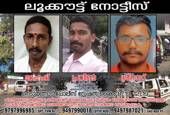 ബോംബെറിഞ്ഞ ആര്എസ്എസ് നെടുമങ്ങാട് ജില്ലാ പ്രചാരക് ആലപ്പുഴ നൂറനാട് എരുമക്കുഴി വടക്കേക്കര വടക്കേതില് പ്രവീണ്, പോലിസ് വാഹനം തടഞ്ഞ് എസ്ഐയുടെ കൈ അടിച്ചൊടിച്ച കേസില് പ്രതികളായ ആനാട് പാണ്ഡവപുരം സ്വദേശി മഹേഷ്, നെടുമങ്ങാട് മേലാംകോട് കൃഷ്ണവിലാസം ശ്രീനാഥ് എന്നിവര്ക്കെതിരെയാണ് ലുക്ക് ഔട്ട് നോട്ടീസ് ഇറക്കിയത്. നെടുമങ്ങാട് പോലിസാണ് നോട്ടീസ് ഇറക്കിയത്. വിമാനത്താവളങ്ങളിലും റെയില്വേ സ്റ്റേഷനിലും നോട്ടീസ് പതിച്ച് ജാഗ്രതാനിര്ദേശം നല്കിയിട്ടുണ്ട്. സംഭവത്തില് ബിജെപി മണ്ഡലം പ്രസിഡന്റ് ജയന് ഉള്പ്പടെ നിരവധിപേര് പിടിയിലായിരുന്നു.
