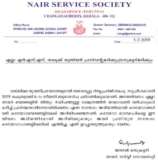 ശബരിമല റിവ്യൂ ഹരജി: നായര് ഭവനങ്ങളില് വഴിപാട് നടത്താന് എന്എസ്എസ് സര്ക്കുലര്