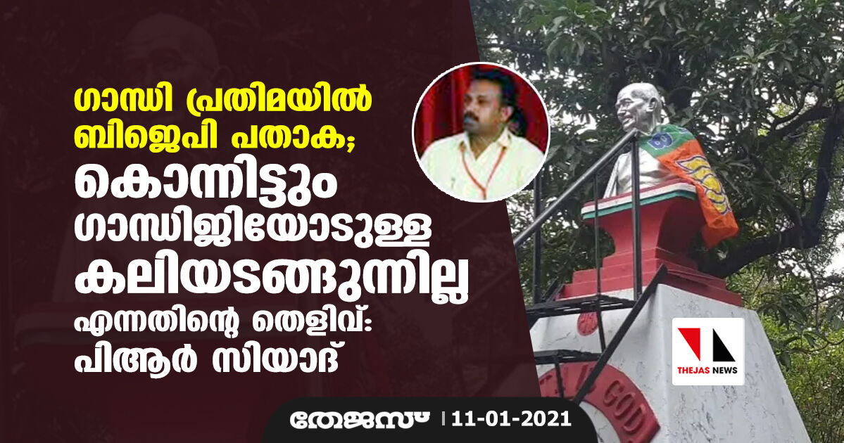 ഗാന്ധി പ്രതിമയില് ബിജെപി പതാക; കൊന്നിട്ടും ഗാന്ധിജിയോടുള്ള കലിയടങ്ങുന്നില്ല എന്നതിന്റെ തെളിവ്: പിആര് സിയാദ്