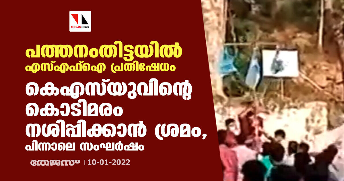 പത്തനംതിട്ടയില് എസ്എഫ്ഐ പ്രതിഷേധം; കെഎസ് യുവിന്റെ കൊടിമരം നശിപ്പിക്കാന് ശ്രമം, പിന്നാലെ സംഘര്ഷം