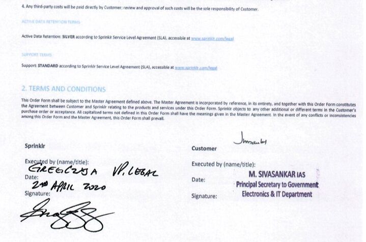മാർച്ച് 25ന് പ്രാബല്യത്തിൽ വന്ന കരാർ ഏപ്രിൽ രണ്ടിനാണ് ഔദ്യോഗിക രൂപത്തിലായത്. ഏപ്രിൽ രണ്ടിന് വന്നിരിക്കുന്ന ഓർഡർ ഫോമിൽ പലകാര്യങ്ങൾ വിശദീകരിക്കുന്നുണ്ട്. ഫോമിൽ അമേരിക്കൻ കമ്പനിയുടെ പ്രതിനിധി ഏപ്രിൽ രണ്ടെന്ന് ഒപ്പിനോടൊപ്പം തീയതി രേഖപ്പെടുത്തിയിരിക്കുന്നു. ഐടി സെക്രട്ടറി സംസ്ഥാന സർക്കാരിന് വേണ്ടി ഏപ്രിൽ രണ്ടിന് ഓർഡർ ഫോമിൽ ഒപ്പ് രേഖപ്പെടുത്തിയിട്ടുമുണ്ട്. സർക്കാർ വെബ്സൈറ്റിൽ പരിശോധിക്കുമ്പോൾ ആ രേഖകൾ ഏപ്രിൽ രണ്ടിനാണ് തയ്യാറാക്കിയതെന്നും വ്യക്തമാണ്. എന്നാൽ അതിനൊപ്പമുള്ള വിവരസുരക്ഷാ ഉറപ്പാക്കൽ കരാറിലാണ് കൃത്രിമം സംശയിക്കുന്നത്.