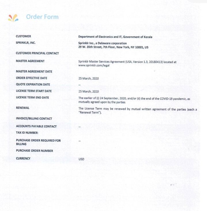 സാധാരണ ഓർഡർ ഫോമിനോടൊപ്പമാണ് കരാറുമായി ബന്ധപ്പെട്ട നിബന്ധനകളും തയ്യാറാക്കുന്നത്. മാർച്ച് 25 മുതൽ പ്രാബല്യത്തിൽ വന്ന കരാറുമായി ബന്ധപ്പെട്ട പ്രധാന നിബന്ധന അടങ്ങിയ കരാർ തയ്യാറാക്കിയത് ഏപ്രിൽ 14ന് ആണെന്നതും ദുരൂഹത സൃഷ്ടിക്കുന്നതാണ്. വിവര സുരക്ഷ ഉറപ്പാക്കുന്ന കരാറിൽ അത് പ്രാബല്യത്തിൽ വരുന്ന തിയ്യതി മാർച്ച് 24 മുതലാണെന്നും വ്യക്തമാക്കുന്നുണ്ട്.