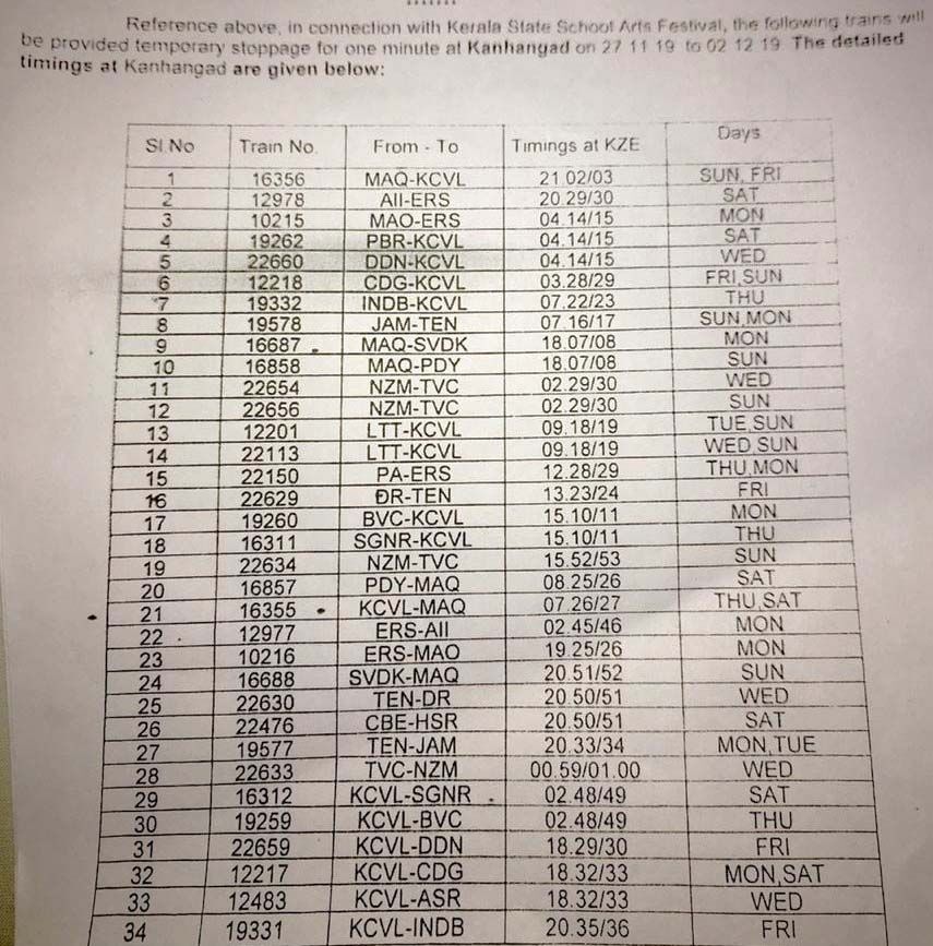 സംസ്ഥാന സ്കൂള് യുവജനോല്സവം: ട്രെയിനുകള്ക്ക് താല്കാലിക സ്റ്റോപ്പ് അനുവദിച്ചു