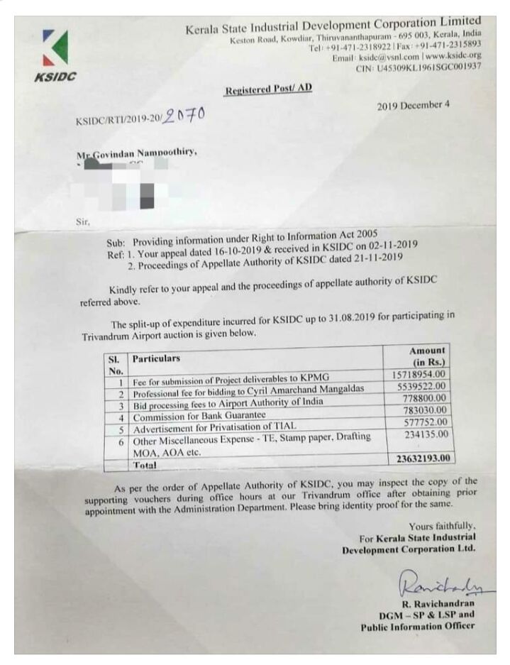 സംസ്ഥാന സര്ക്കാരിനു കീഴിലുള്ള കെഎസ്ഐഡിസി എയര്പോര്ട്ട് അതോറിറ്റി ഓഫ് ഇന്ത്യയുടെ ലേലത്തിനു മാത്രം ചെലവാക്കിയത് 2.36 കോടി രൂപയാണ്. ഇതിനുള്ള പ്രൊജക്ട് തയാറാക്കലിനു രാജ്യാന്തര കണ്സള്ട്ടിങ് കമ്പനിയായ കെപിഎംജിക്ക് ഒന്നരക്കോടിയിലേറെ രൂപ നല്കി. പ്രഫഷനല് ഫീസായി സിറിള് അമര്ചന്ദ് മംഗല്ദാസ് എന്ന നിയമ സ്ഥാപനത്തിന് 55,39,522 രൂപയും കൊടുത്തതായി കൊച്ചി സ്വദേശി ഗോവിന്ദന് നമ്പൂതിരിക്ക് നല്കിയ വിവരാവകാശ രേഖയില് പറയുന്നുണ്ട്. പൊതുമേഖലയില് സാങ്കേതിക കണ്സള്ട്ടന്സി സ്ഥാപനമായ കിറ്റ്കൊ പോലുള്ള സ്ഥാപനങ്ങളുള്ളപ്പോള് രാജ്യാന്തര കണ്സള്ട്ടിങ് കമ്പനിക്കും നിയമ സ്ഥാപനത്തിനും ഇത്ര തുക നല്കിയതില് സര്ക്കാരിനെതിരേ ആരോപണം ഉയര്ന്നിട്ടുണ്ട്.