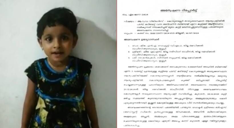 പാമ്പ് കടിയേറ്റ് മൂന്നുവയസുകാരി മരിച്ച സംഭവം; ഡ്യൂട്ടി ഡോക്ടര്ക്കെതിരേ അന്വേഷണ റിപോര്ട്ട്