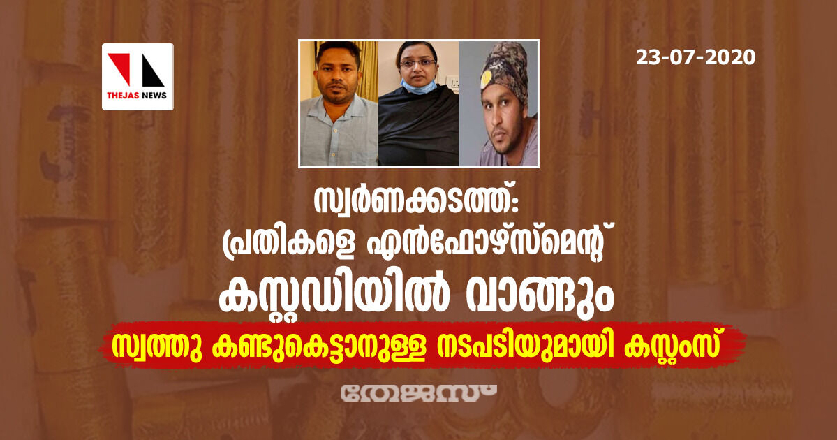 സ്വര്ണക്കടത്ത്: പ്രതികളെ എന്ഫോഴ്സ്മെന്റ് കസ്റ്റഡിയില് വാങ്ങും; സ്വത്തു കണ്ടുകെട്ടാനുള്ള നടപടിയുമായി കസ്റ്റംസ്