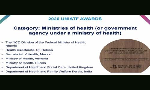 യുഎന്ഐഎടിഎഫ് എല്ലാ വര്ഷവും നല്കി വരുന്ന മികച്ച ജീവിതശൈലീ രോഗനിയന്ത്രണ പ്രവര്ത്തനങ്ങള് നടത്തുന്നവര്ക്ക് നല്കിവരുന്ന അവാര്ഡാണ് ആദ്യമായി ഇത്തവണ കേരളത്തിന് ലഭിച്ചത്. 2020ല് ഐക്യരാഷ്ട്രസഭ ഈ അവാര്ഡിനായി സര്ക്കാര് വിഭാഗത്തില് തിരഞ്ഞെടുത്ത ഏഴുരാജ്യങ്ങള്ക്കൊപ്പമാണ് കേരളത്തിലെ ആരോഗ്യവകുപ്പിനെ തിരഞ്ഞെടുത്തത്. റഷ്യ, ബ്രിട്ടന്, മെക്സികോ, നൈജീരിയ, അര്മേനിയ, സെന്റ് ഹെലന എന്നിവയ്ക്കൊപ്പമാണ് കേരളത്തിന് ഈ അവാര്ഡ് ലഭിച്ചത്. ആരോഗ്യവകുപ്പ് നടപ്പിലാക്കി വരുന്ന ജീവിതശൈലീ രോഗനിയന്ത്രണ പദ്ധതിയുടെ മികവിന്റെ അടിസ്ഥാനത്തിലാണ് ഈ അവാര്ഡ് ലഭിക്കുന്നത്.