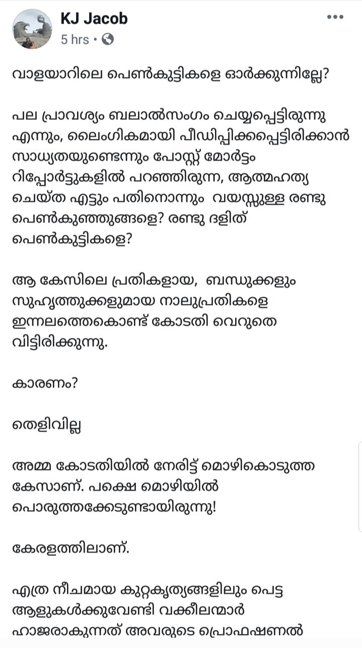 വാളയാർ പീഡനക്കേസിൽ മന്ത്രി എ കെ ബാലനെതിരെ വിമർശനം ഉന്നയിച്ചുള്ള ഫേസ്ബുക്ക് പോസ്റ്റ് വൈറലാവുന്നു.