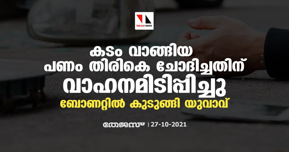 കടം വാങ്ങിയ പണം തിരികെ ചോദിച്ചതിന് വാഹനമിടിപ്പിച്ചു; ബോണറ്റില് കുടുങ്ങി യുവാവ്