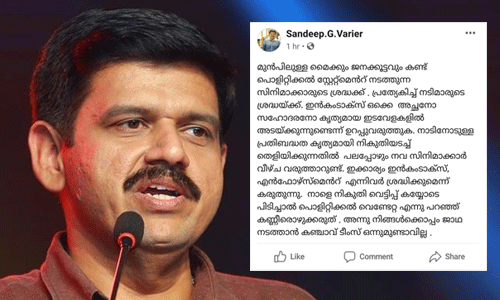 നവ സിനിമക്കാര് നികുതി അടയ്ക്കുന്നതില് വീഴ്ച വരുത്താറുണ്ടെന്നും ഇക്കാര്യം ആദായ നികുതി വകുപ്പ് ശ്രദ്ധിക്കണമെന്നും സമൂഹ മാധ്യമത്തിലെ പോസ്റ്റില് സന്ദീപ് പറഞ്ഞു. നികുതി വെട്ടിപ്പ് കയ്യോടെ പിടിച്ചാല് കണ്ണീരൊഴുക്കരുതെന്നും അന്ന് ജാഥ നടത്താന് കഞ്ചാവ് ടീംസ് ഉണ്ടാകില്ലെന്നും പോസ്റ്റില് മുന്നറിയിപ്പുമുണ്ട്.