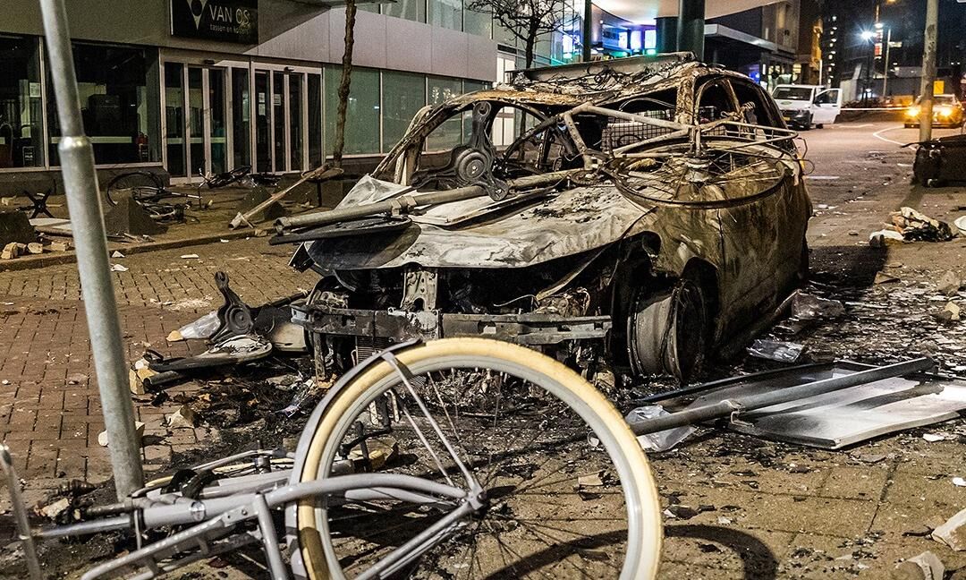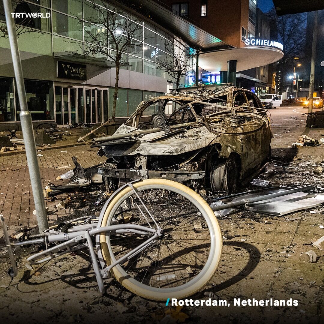 നെതര്ലന്റ്സ് നഗരമായ റോട്ടര്ഡാമില് പ്രക്ഷോഭകര് കത്തിച്ച കാറും സൈക്കിളും