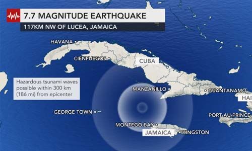 ജമൈക്കന് തീരത്ത് അതിശക്തമായ ഭൂചലനം; റിക്ടര് സ്കെയിലില് 7.7 തീവ്രത (വീഡിയോ)